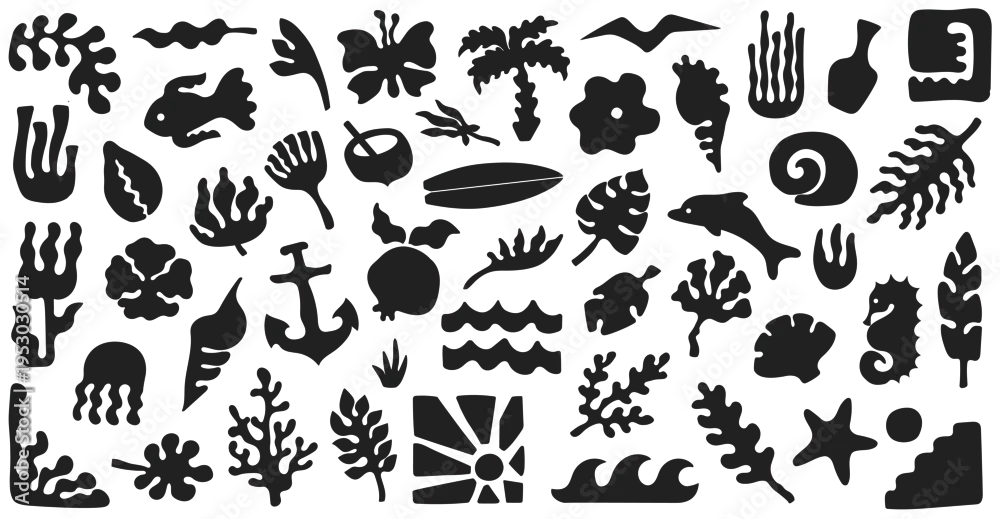 Fototapeta samoprzylepna Tropical ocean symbol set, abstract marine silhouettes, boho summer icons. Branding, logo, sticker, packaging, surf shop, beach club, coastal decor assets. Vector illustration.