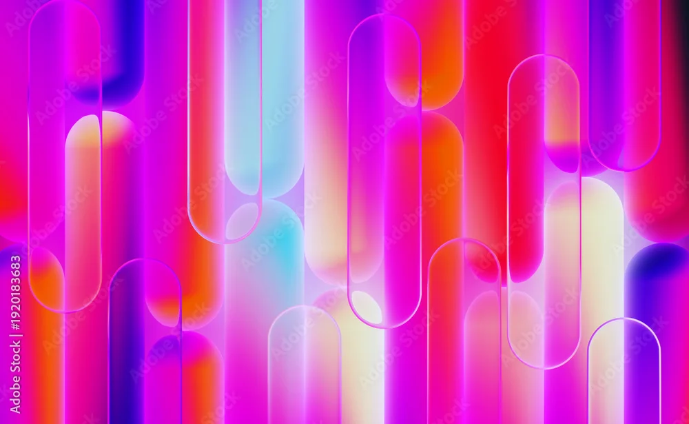 Vertical striped liquid glass pattern with vibrant neon gradient. Abstract render 3d background with smooth transparent rounded lines and overlapping effect. Colorful modern wallpaper. 3D illustration