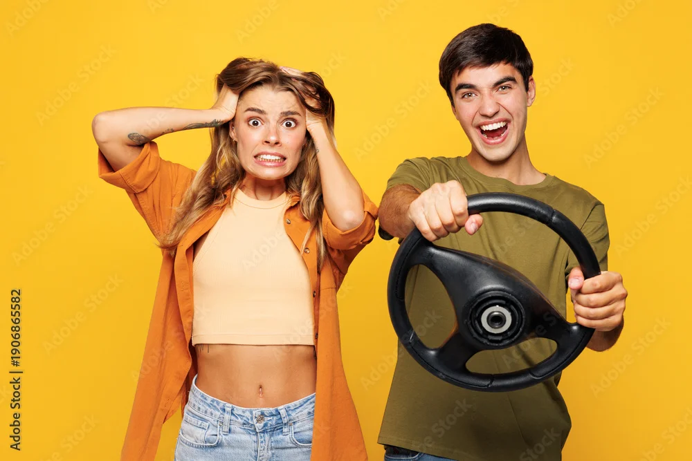 Fototapeta samoprzylepna Young fearful couple two friends family man woman wear casual clothes look camera hold head steering wheel driving car together isolated on pastel plain light yellow color background studio portrait.