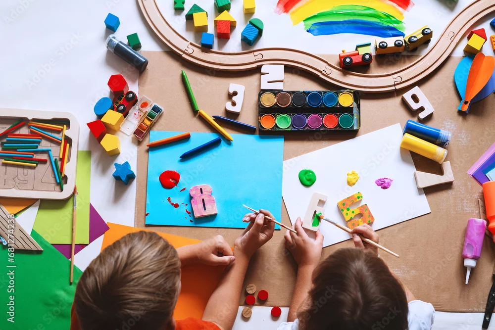 Fototapeta samoprzylepna Children drawing and making crafts in kindergarten or daycare.