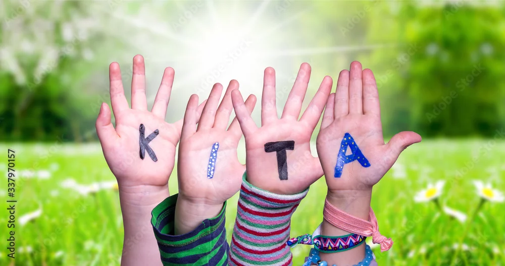 Fototapeta samoprzylepna Children Hands Building Colorful German Word KITA Means Kindergarden. Sunny Green Grass Meadow As Background