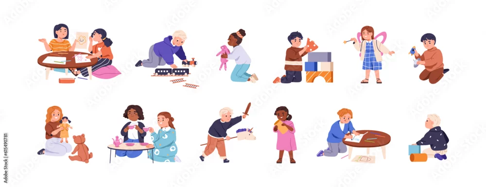 Cute children playing games with toys. Little boys and girls doing leisure activities in nursery playroom. Happy childhood of kindergarten kids. Flat vector illustrations isolated on white background
