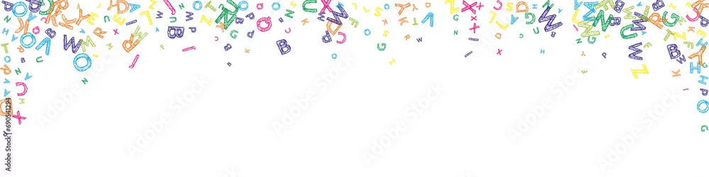 Fototapeta samoprzylepna Falling letters of English language. Colorful messy sketch flying words of Latin alphabet. Foreign languages study concept. Incredible back to school banner on white background.