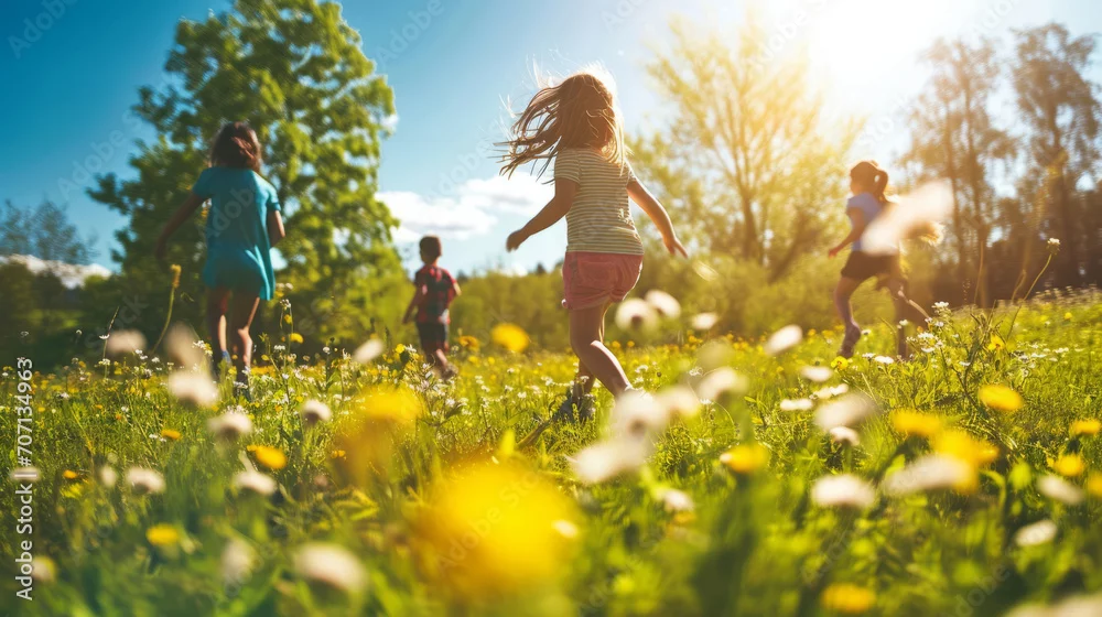 Fototapeta samoprzylepna Group of happy preschool children running on summer meadow in park