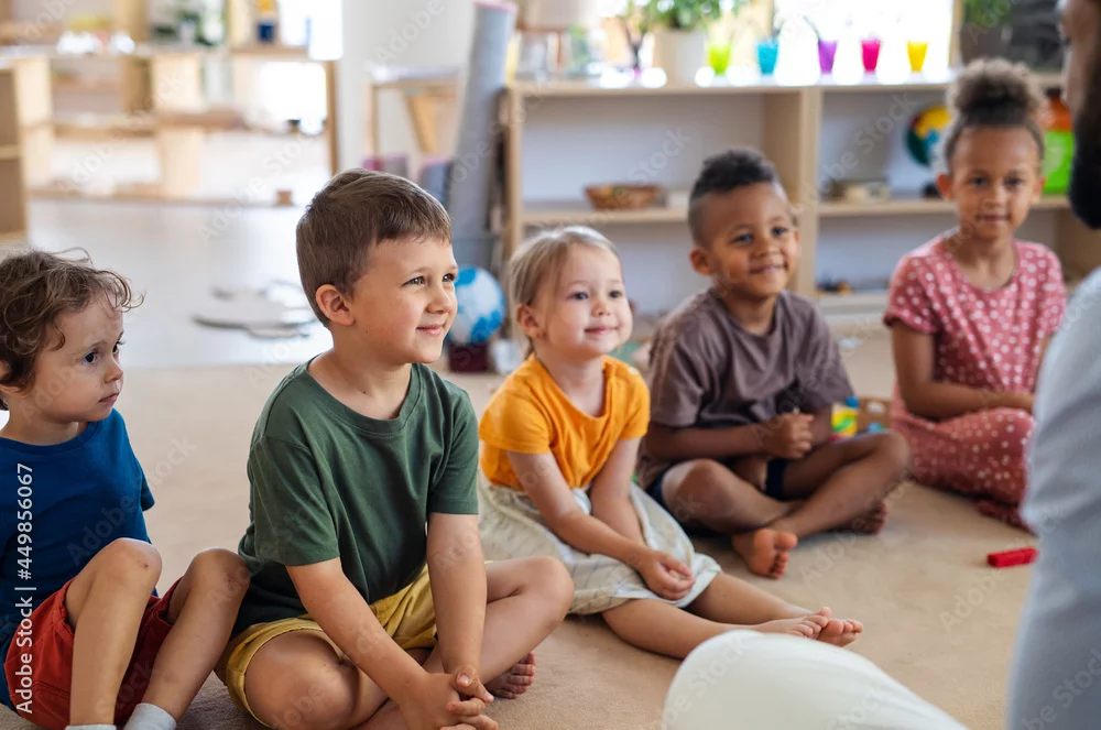 Fototapeta samoprzylepna Group of small nursery school children sitting on floor indoors in classroom.