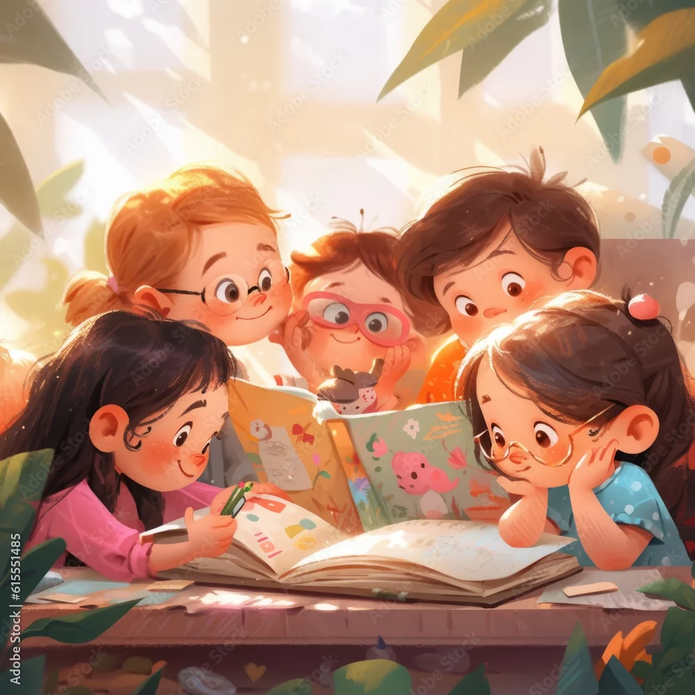 Illustration of a group of schoolchildren studying outside on a sunny day. Cute young pupils reading a book in the garden. Teamwork, kids and education concept. AI generated 3D illustration