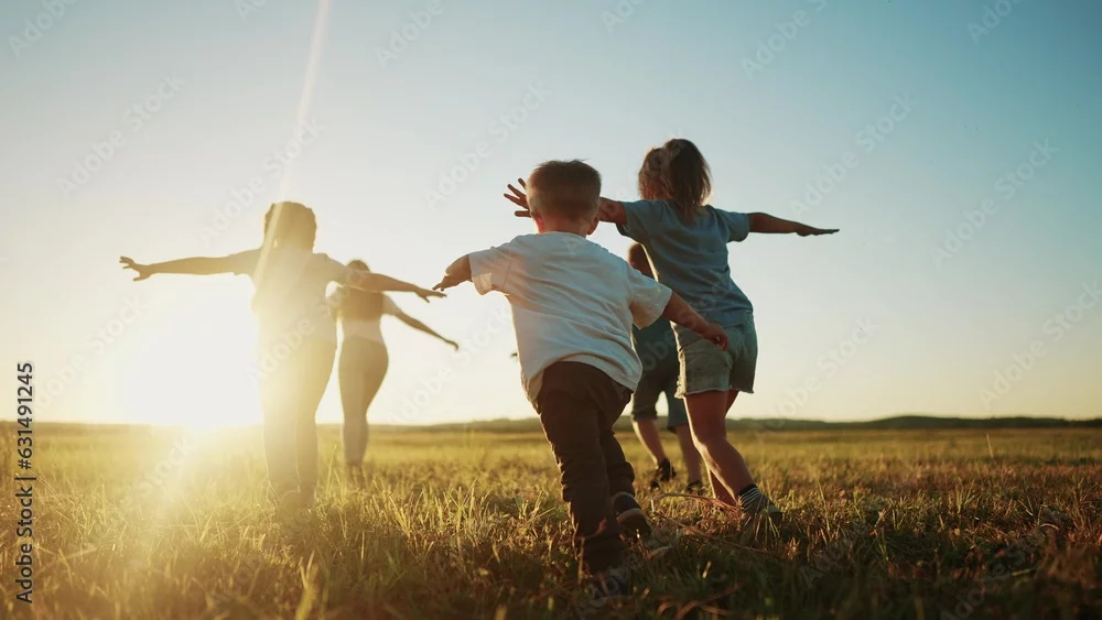 kids run in the park at sunset. friendly family children camp kid dream concept. a group of children run on the grass at the rays fun of the sun silhouette. childhood dream teamwork sunset concept