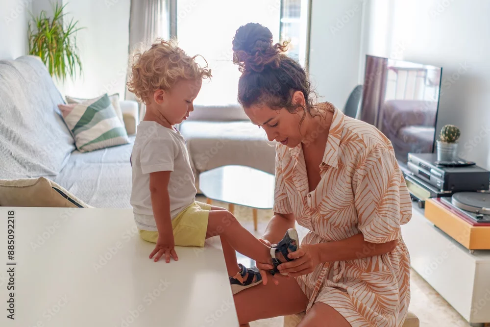 Fototapeta samoprzylepna Mother, child and shoes in preparation for school, learning or education in the livingroom at home. Mom helping little boy with shoe getting ready for kindergarten at the house