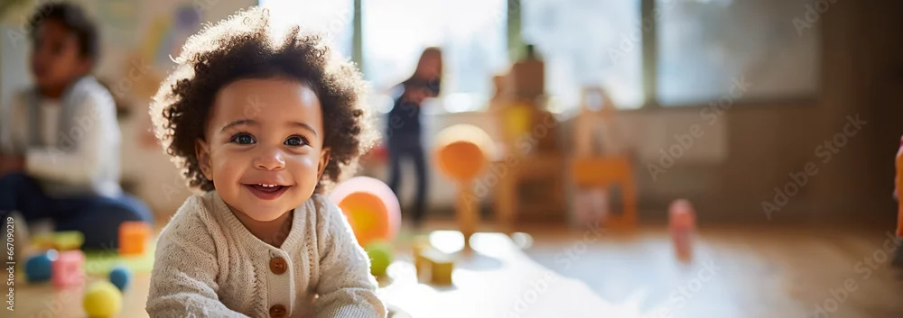 Fototapeta samoprzylepna multicultural daycare center with African American toddler babies. Group of workers with babies in nursery or kindergarten playful.