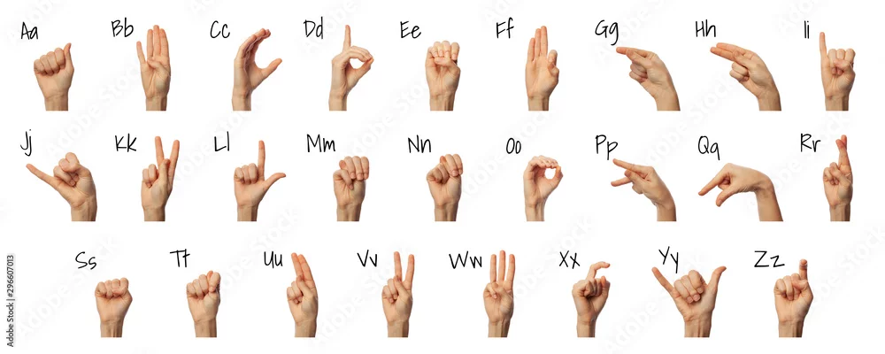Fototapeta samoprzylepna Woman showing ASL alphabet on white background. Sign language concept