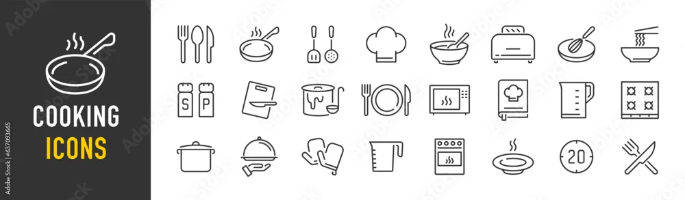Fototapeta samoprzylepna Cooking web icons in line style. Frying pan, fork, knife, recipe book, microwave, collection. Vector illustration.