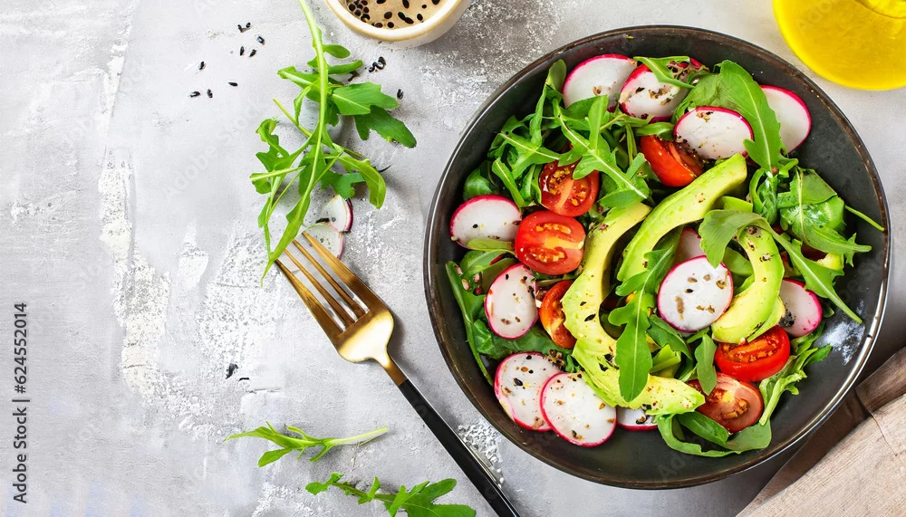 Fototapeta samoprzylepna Diet menu. Healthy salad of fresh vegetables - tomatoes, avocado, arugula, radish and seeds on a bowl. Vegan food. Flat lay. Banner. Top view