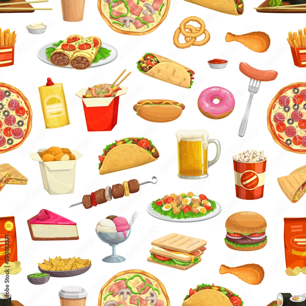 Fototapeta samoprzylepna Fast food pattern, seamless background, vector hamburgers, pizza and burger sandwiches. Fastfood, menu hot dog, fries, drinks and snacks, ice cream, donut, burrito and noodles pattern background