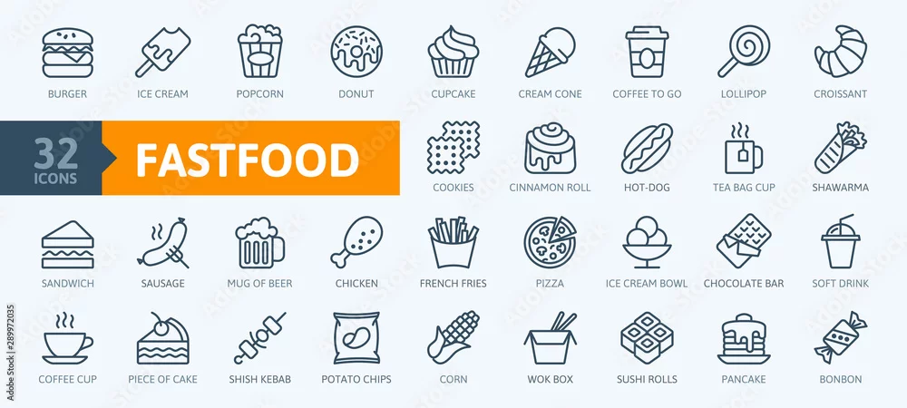 Fototapeta samoprzylepna Fastfood - zarys zestaw ikon web, wektor, kolekcja ikon cienka linia