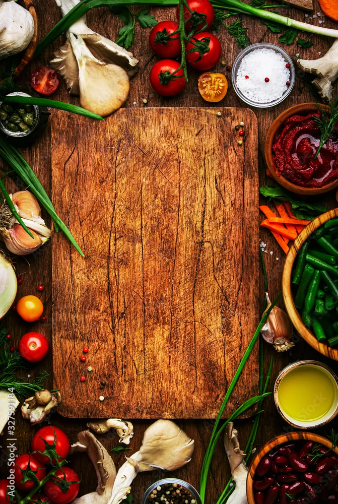 Fototapeta samoprzylepna Food cooking background, ingredients for preparation vegan dishes, vegetables, roots, spices, mushrooms and herbs. Cutting board. Healthy food concept. Rustic wooden table, top view - do restauracji - Picturewall.pl