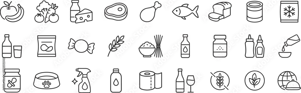 Fototapeta samoprzylepna Grocery food and product categories line icon set with items like fruits, meat, pasta and beverages. Vector illustration pictograms of snacks, candy, sauces, cereal, grains, wine, editable stroke.
