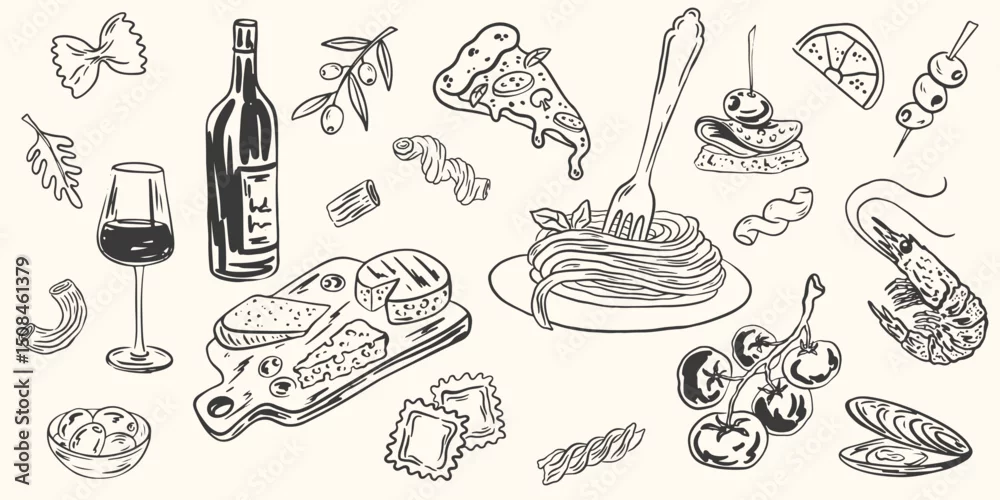 Fototapeta samoprzylepna Hand drawn crayon food illustration. Sketch style lunch or dinner, mediterranean. Vector of wine, charcuterie, spaghetti illustrations for invitations, menus, parties. La dolce vita italian style