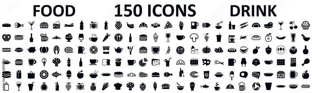 Fototapeta samoprzylepna Jedzenie i napoje ustawiają 150 ikon dla menu, infographics, projektów elementy - akcyjny wektor - do restauracji - Picturewall.pl