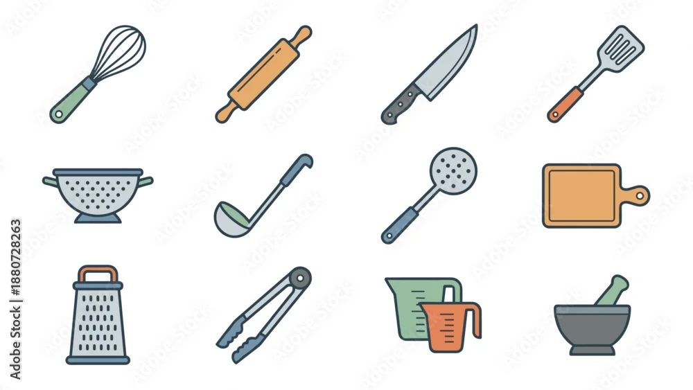 Fototapeta samoprzylepna Kitchen utensil icons set. Cooking tools vector collection. Culinary equipment symbols. Food preparation instruments. Chef gadgets. Geometric flat style. Restaurant essentials.