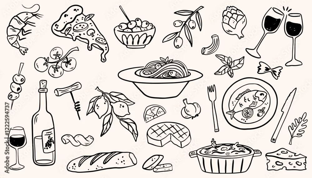 Mediterranean food set. Minimalist hand drawn food and drinks collection. Set of doodles, rough simple Italian cuisine food sketches. Vector illustration isolated on white background