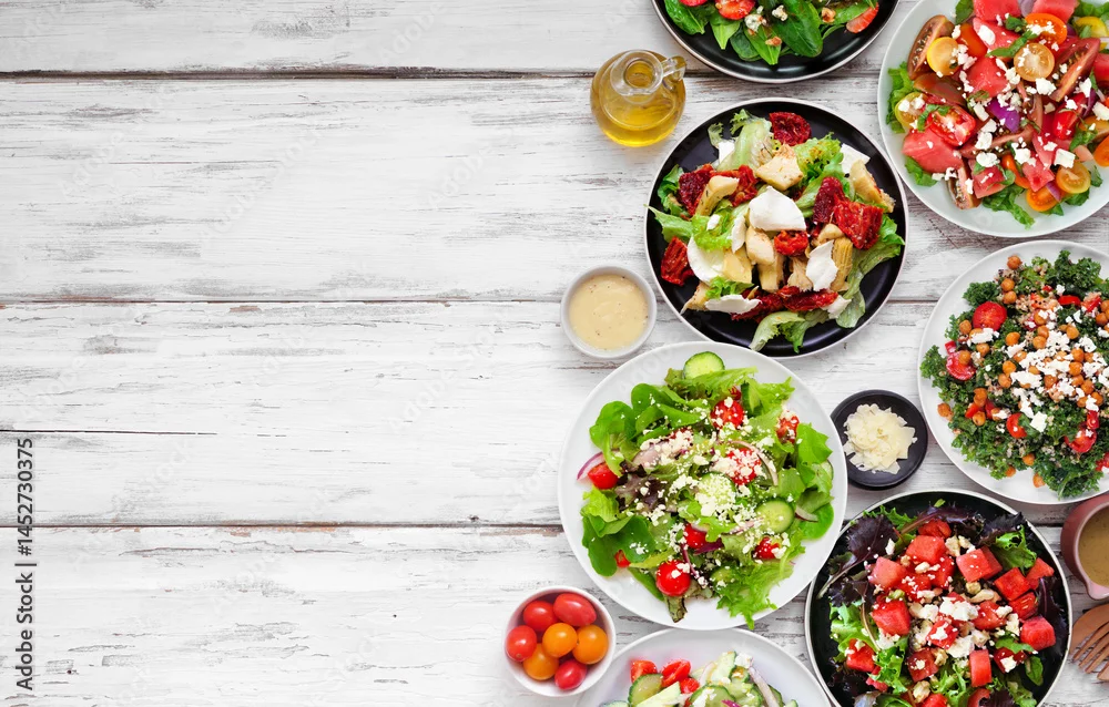 Fototapeta samoprzylepna Variety of delicious fresh salads. Overhead view side border on a white wood background. Summer food concept.