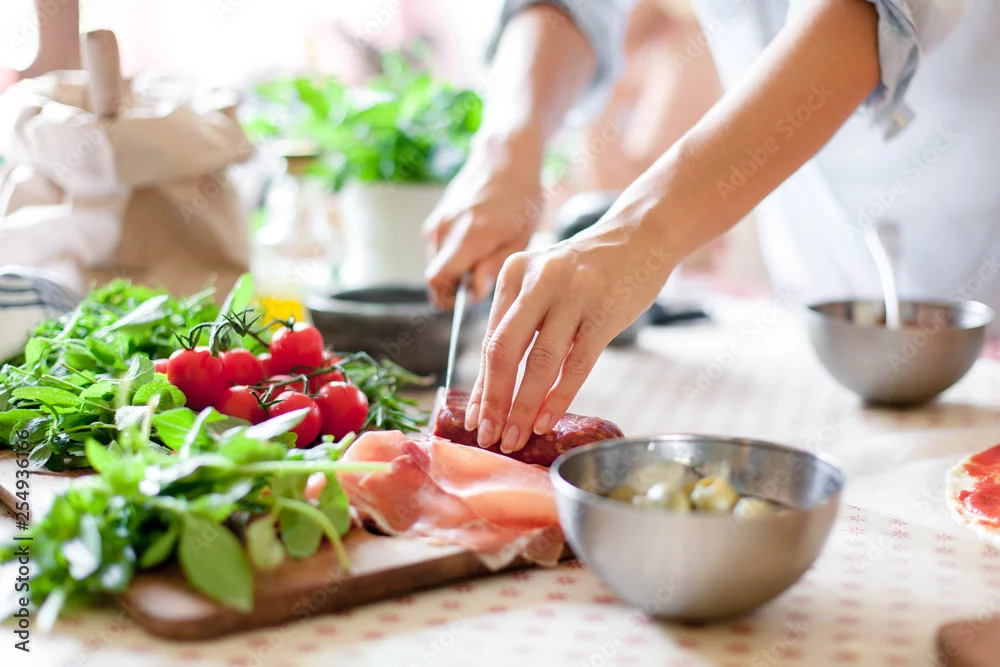 Fototapeta samoprzylepna Woman is cooking in home kitchen. Female hands cut salami, vegetables, greens, tomatoes on table on wooden boards. Ingredients for preparing italian or french food. Lifestyle moment.