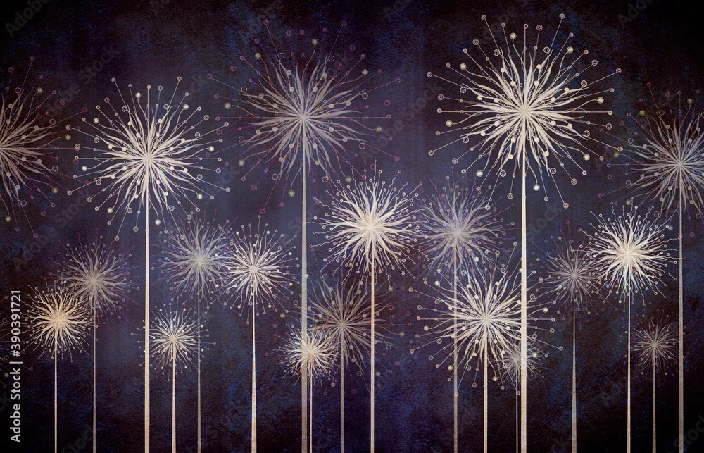 Fototapeta samoprzylepna Cosmic stylized dandelions on dark textured background. Interior printing, fresco art, photo Wallpapers. - do salonu - Picturewall.pl