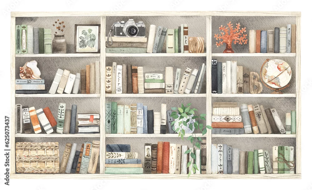 Fototapeta samoprzylepna Shelves with books and decoration elements, imaginary illustration hand-drawn watercolor. Cabinet with books, globe, camera, nautical symbols and houseplant. Traveler's Library.