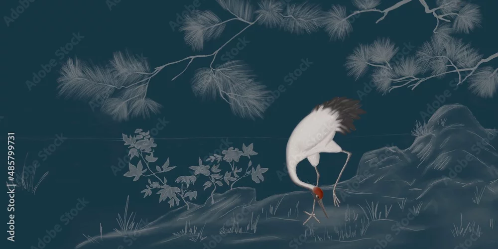 Fototapeta samoprzylepna White crane, dark blue background. Abstract watercolor paint background grunge texture. Interior Wallpaper. Mural for the walls, fresco for the room, interior grunge style