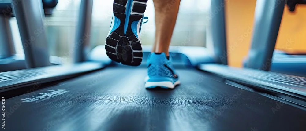 Close up of feet, sportman runner running on treadmill in fitness club. The individual, a dedicated athlete, is actively training in the gym, emphasizing a commitment to a healthy lifestyle.