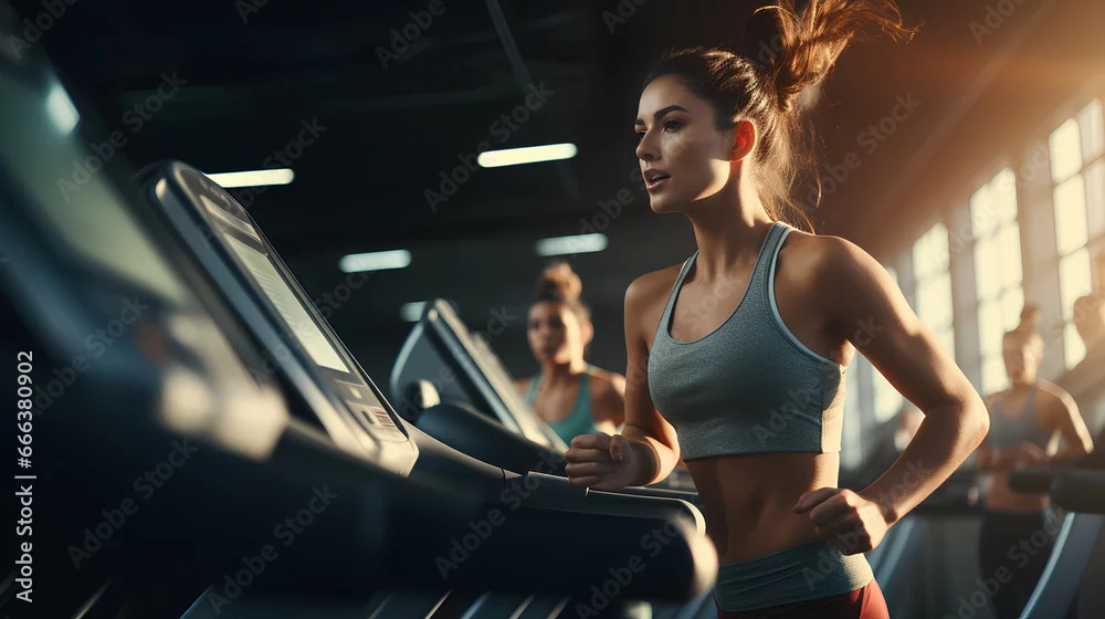 Fototapeta samoprzylepna Female in fitness clubs run on treadmills. - do siłowni - Picturewall.pl