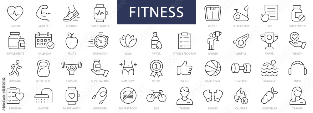 Fototapeta samoprzylepna Fitness and Sport thin line icons set. Fitness editable stroke icon. Fitness, Sport, Gym, Cardio, Running, Diet, Yoga, Health symbol. Vector
