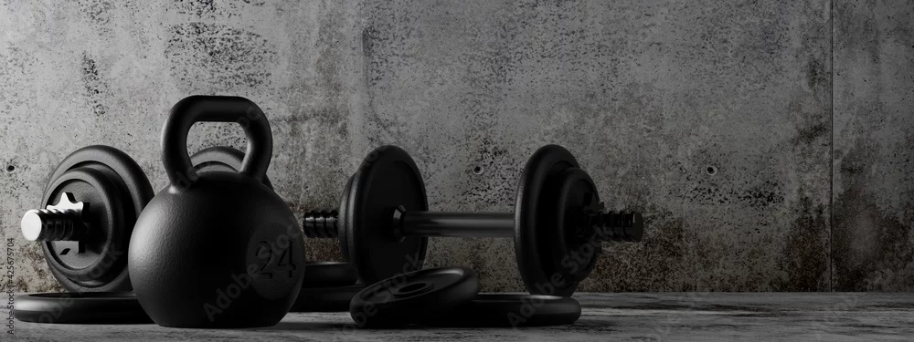 Fitness gym dumbbells and kettlebells with chrome handle and black plates in concrete room background, muscle exercise, bodybuilding or fitness concept
