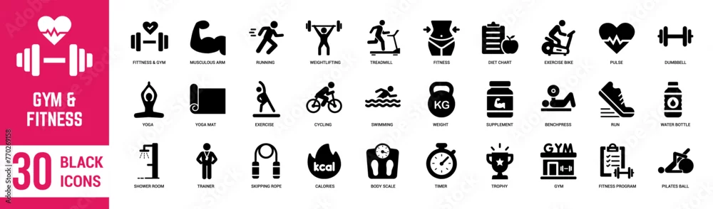 Fototapeta samoprzylepna Gym and Fitness solid icon set. Fitness, sport, exercise, gym, diet, dumbbell, protein, calories, yoga, cardio and weightlift. Vector illustration