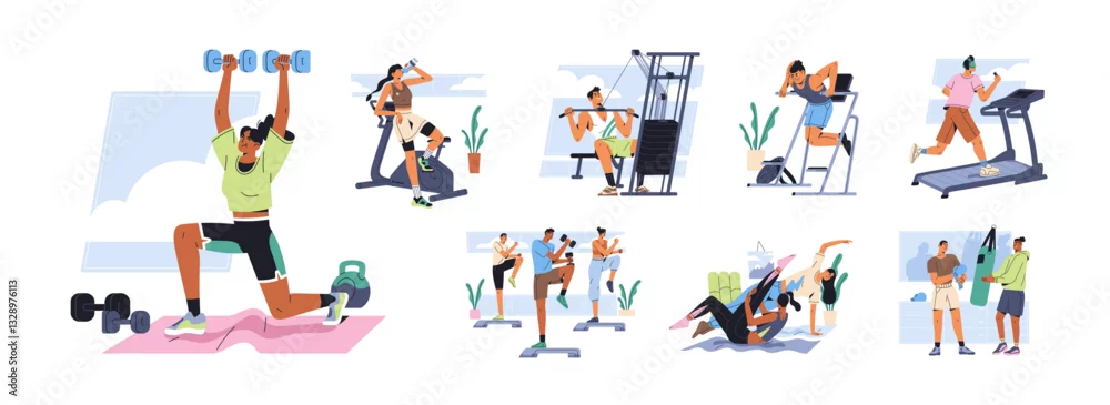 Fototapeta samoprzylepna People in fitness gym set. Athletes in sportswear do cardio and strength training with sports equipment. Sportsmen and sportswomen do exercise at workout. Flat isolated vector illustrations on white