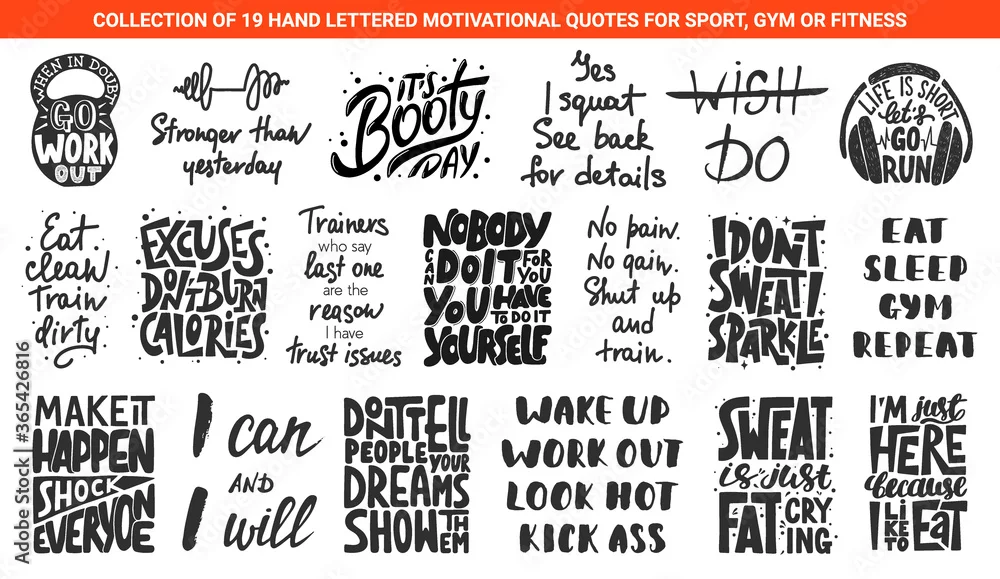 Set of 19 motivational and inspirational lettering gym or fitness quotes for posters, decoration, prints, t-shirt design. Hand drawn typography. Handwritten sport slogans. Modern brush calligraphy.