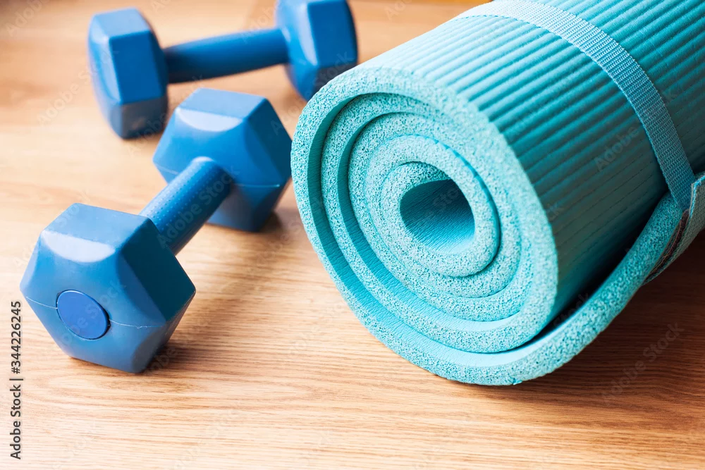 Fototapeta samoprzylepna Sport fitness equipment, female concept, yoga mat, bottle of water, dumbbells.