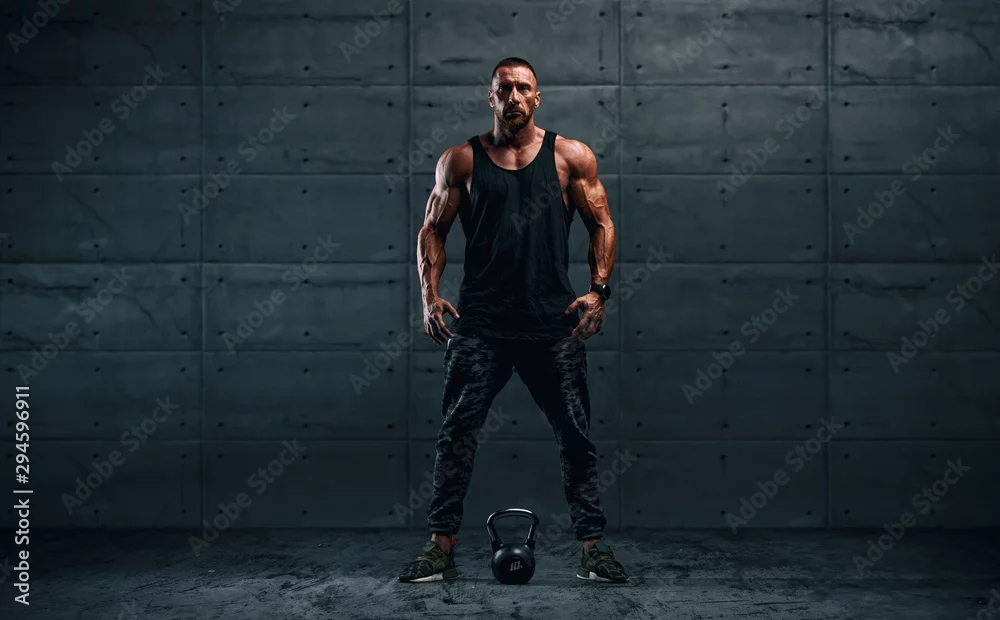 Fototapeta samoprzylepna Strong Muscular Men, Cross Training Athlete Exercise With Kettlebell. Copy Space