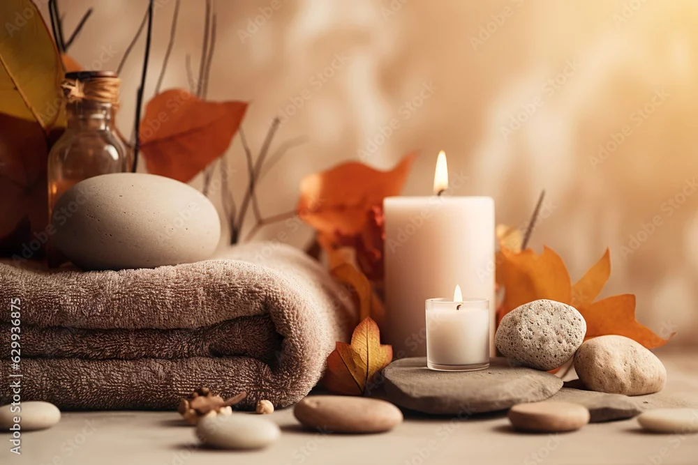 Fototapeta samoprzylepna Autumn spa scene with candles, stones and towel, in earthy tones.