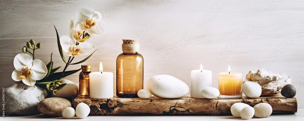 Fototapeta samoprzylepna Beauty treatment items for spa procedures on white wooden table and marble wall. massage stones, essential oils and sea salt. candle, rolled up white towel, plants, copy space