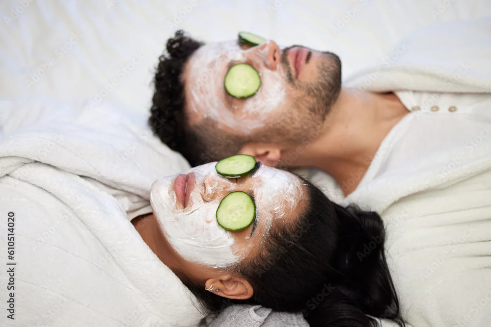 Facial, spa and relax with couple and mask for skincare, cosmetics and detox treatment. Beauty, face and self care weekend with man and woman in bedroom at home for salon, wellness and cucumber