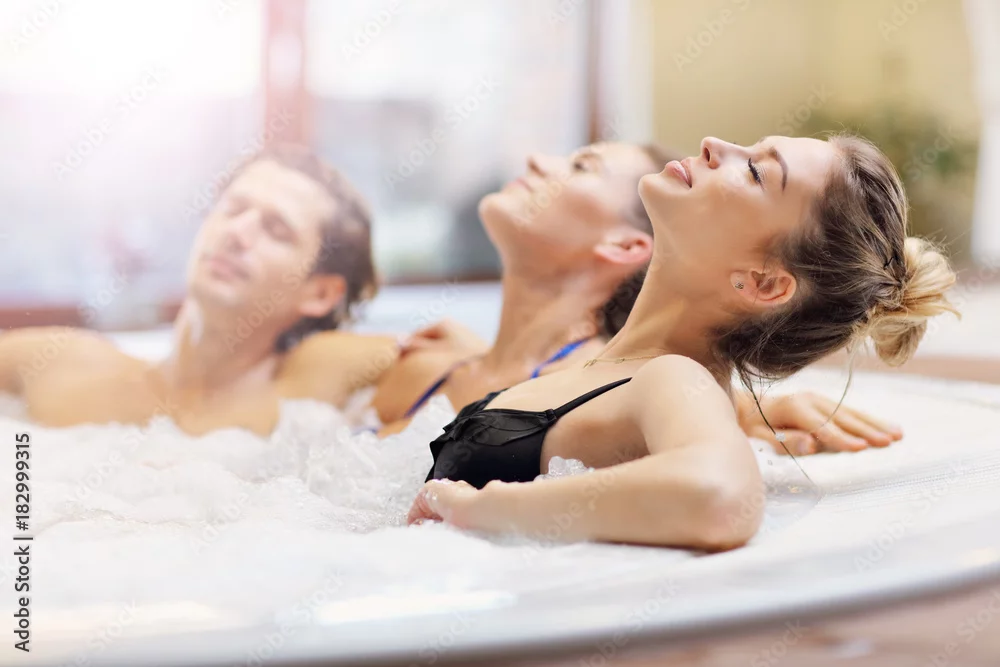 Fototapeta samoprzylepna Grupa przyjaciół korzystających z jacuzzi w hotelowym spa - do spa - Picturewall.pl