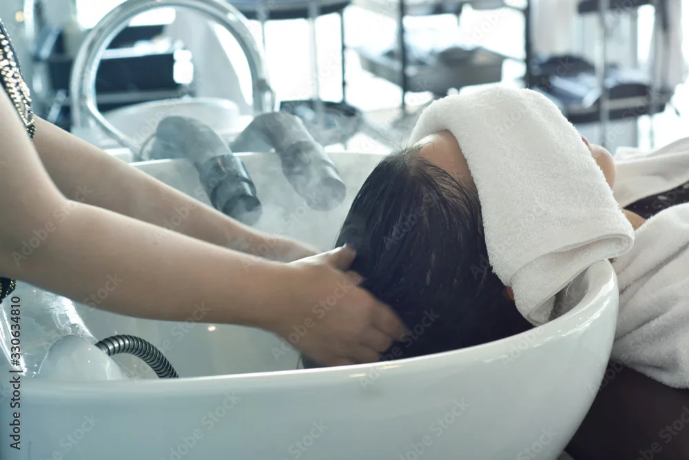 Hairdresser in beauty salon massage head customer and hair care in procedure of steaming water steam. Service steaming ozone in spa and salon shop.
