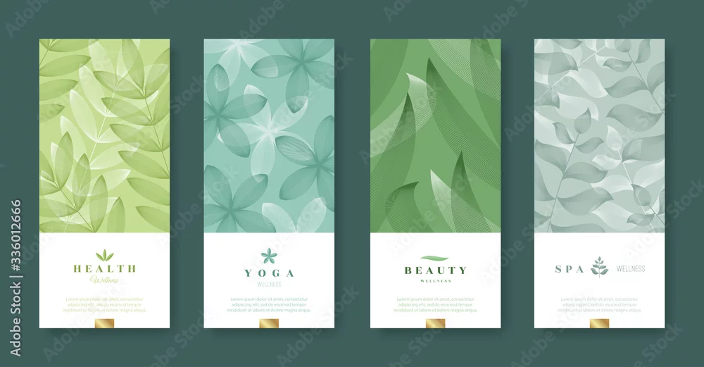 Leaves and nature banner set. Beauty and health minimal design. Voucher template with logo - health, yoga, beauty, spa. Vector illustration.