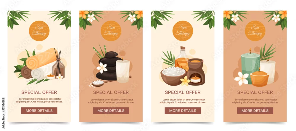 Fototapeta samoprzylepna Social media stories and front page cover templates spa collection. Special offer design with exotic flowers, bamboo leaves, cosmetics, aromatherapy. Promotional spa salon branding vector Illustration