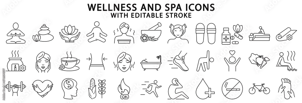 Fototapeta samoprzylepna Wellness and spa icons. Wellness and spa icon set. Wellness line icons. Vector illustration Editable stroke.