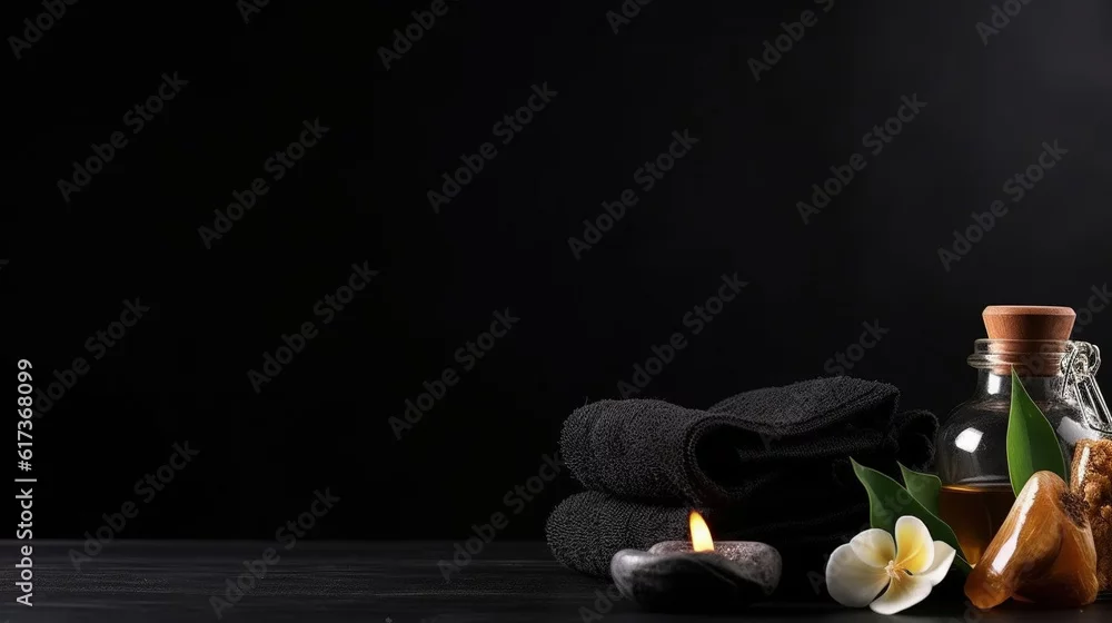 Fototapeta samoprzylepna Zen stones. Spa background with spa accessories on a dark background. Free space for your text. AI Generative