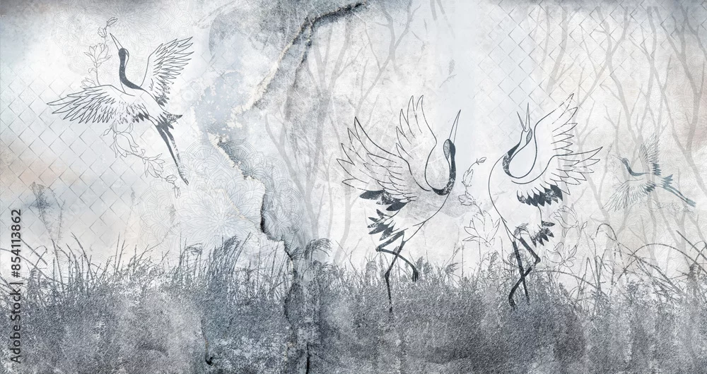 Fototapeta samoprzylepna Cranes dancing in the grass on the background of a concrete wall. Navy blue texture for wallpaper