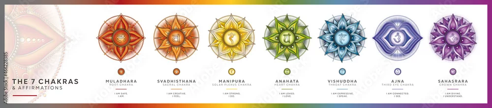 Fototapeta samoprzylepna Chakra symbols set with affirmations. Perfect for kinesiology practitioners, massage therapists, reiki healers, yoga studios or your meditation space.