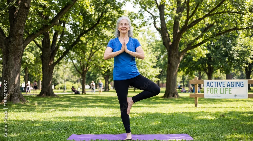 Senior woman practicing yoga tree pose outdoors in sunny green park, promoting active aging, healthy lifestyle, balance, mindfulness, and physical wellness among older adults